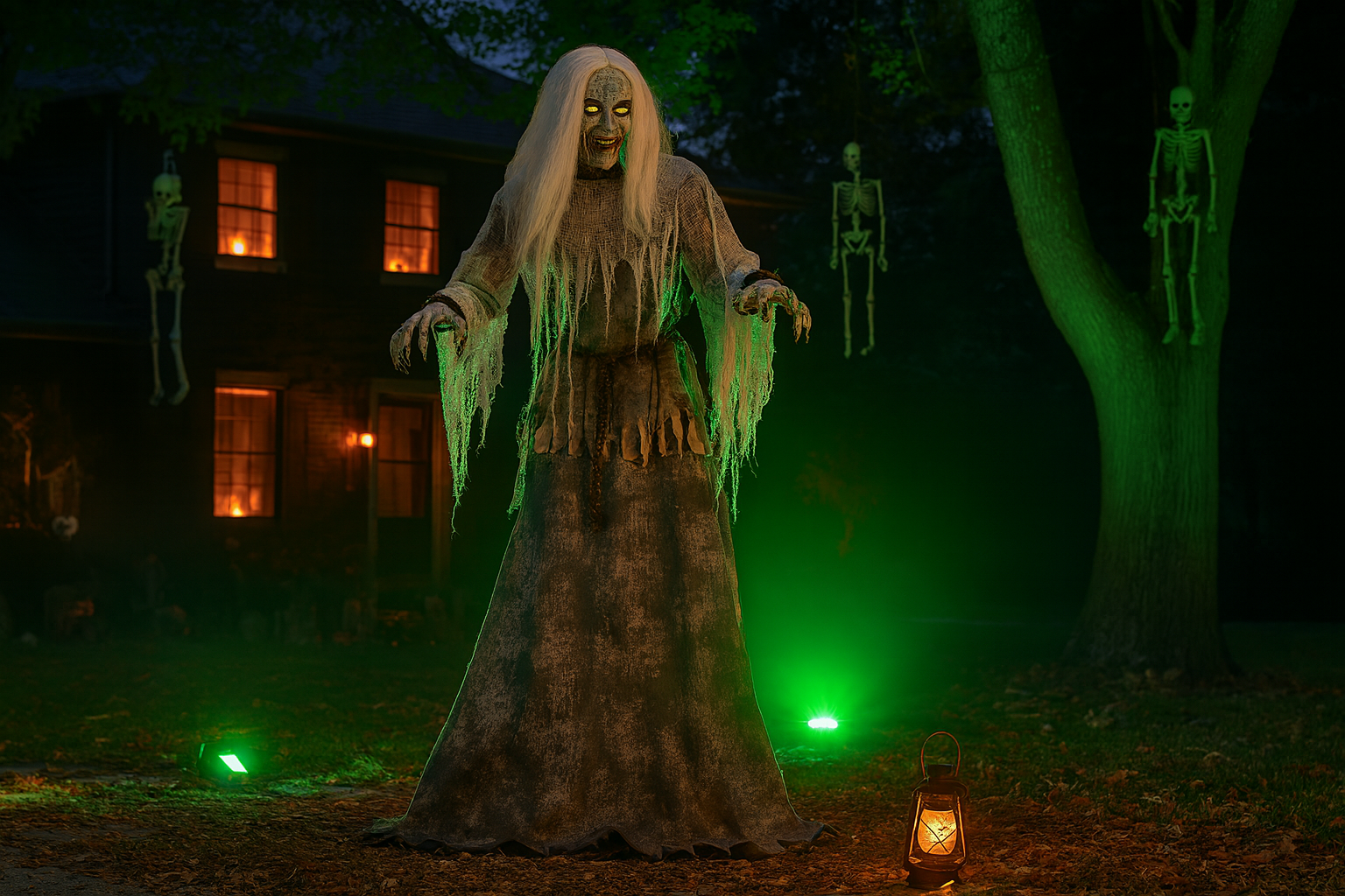 • Porch: Use warm lanterns or flickering bulbs to frame the figure and draw attention to its face.