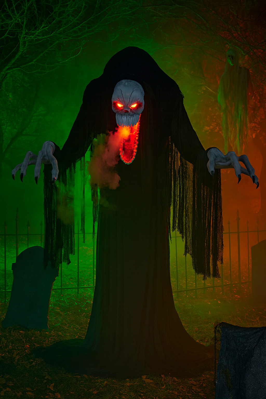 Death Stalker towers at over 7 feet tall, a monstrous silhouette wrapped in decayed robes and pure predatory intent. With glowing red eyes, snapping jaws, and sudden lunging movements, this animatronic feels like it’s actively hunting anyone who wanders too close. Its guttural growls and sharp, jerking motions make it a terrifying anchor for any haunted trail or graveyard scene, delivering that high‑impact scare factor Spirit Halloween is known for.