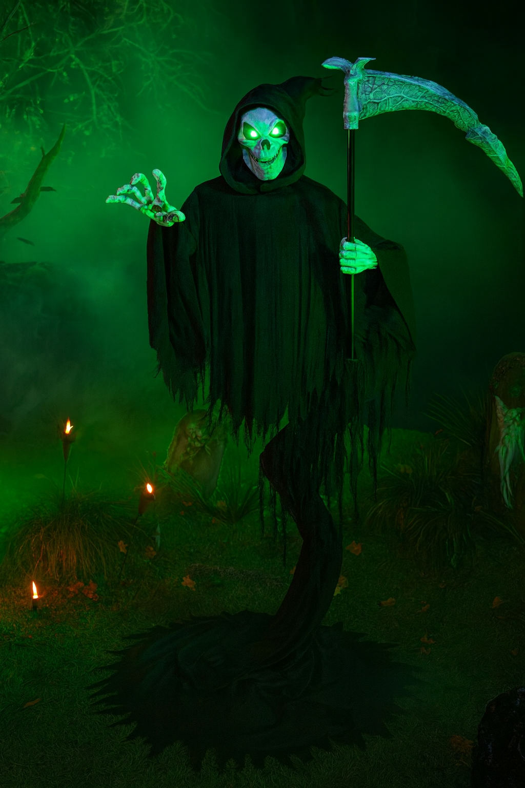 Jack the Reaper towers at 7 ft. 6 in., bringing a cinematic, bone‑chilling presence to any yard haunt. Cloaked in tattered robes and gripping his massive scythe, he looms forward with glowing eyes and deep, resonant audio that feels like it’s echoing straight out of the underworld. His slow, deliberate movements make every encounter feel personal — like he’s choosing his next soul. As a centerpiece for a graveyard scene or a standalone statement prop, Jack delivers pure Halloween intimidation with every stare.